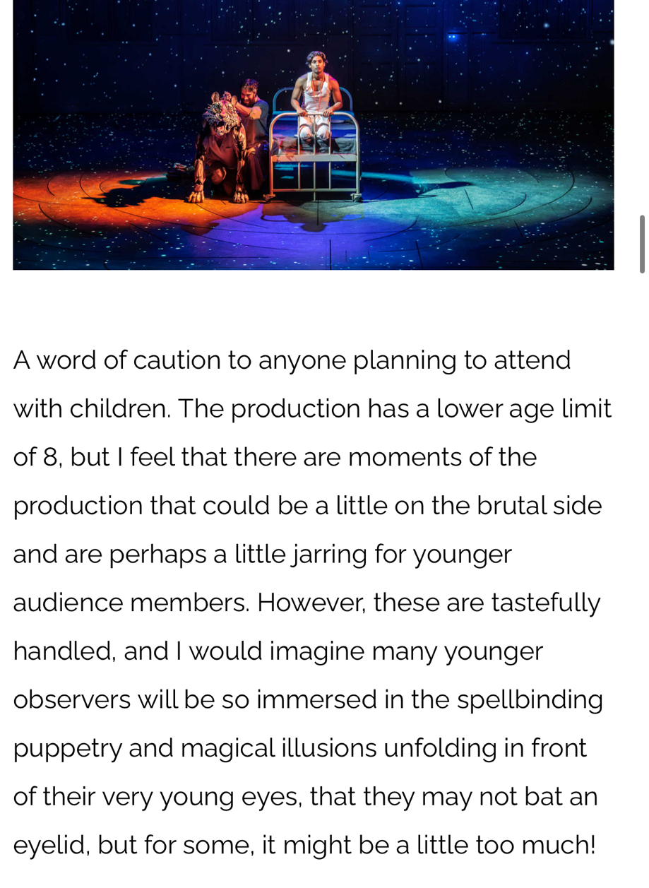 아이들과 함께 방문할 계획이 있는 사람들에게 주의의 이야기를 전한다. 연령제한을 8세로 해놓았지만 어린 관객들에게 잔혹하고 충격적인 장면이 있을 것 같다는 내용이다. 그러나 다른 한편으로 그것이 세련되게 표현되었다고 퍼펫이 나오는 아름다운 연출등에 빠질 수 있다고 평한다. 실제로 나 역시, 생각보다 어린아이들이 그들에게 보이는 인지작용 안에서 어떤 필터가 작용하여서인지 어른들이 잔인하거나 폭력적으로 느끼는 것보다도 정도를 덜 느끼고 기억에 남지 않아 하는 경험이 있어 괜찮은 걸까라는 생각을 하기도 했다.