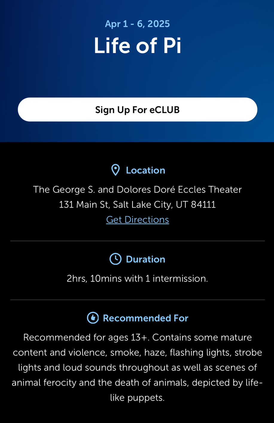공연은 8세 이상의 관람가로 되어있다. 영화가 아닌 공연 ‘라이프 오브 파이’는 이미 해외에서 올라간 바 있는 극이며, 영국에서 공연이 될 때는 이 같은 나이제한으로 올라갔다. 그렇기 때문에 우리나라에 들어올 때도 8세로 들어온 것으로 보인다. 고개를 갸우뚱하던 차에 나와 같은 의견을 가진 평을 발견했다.