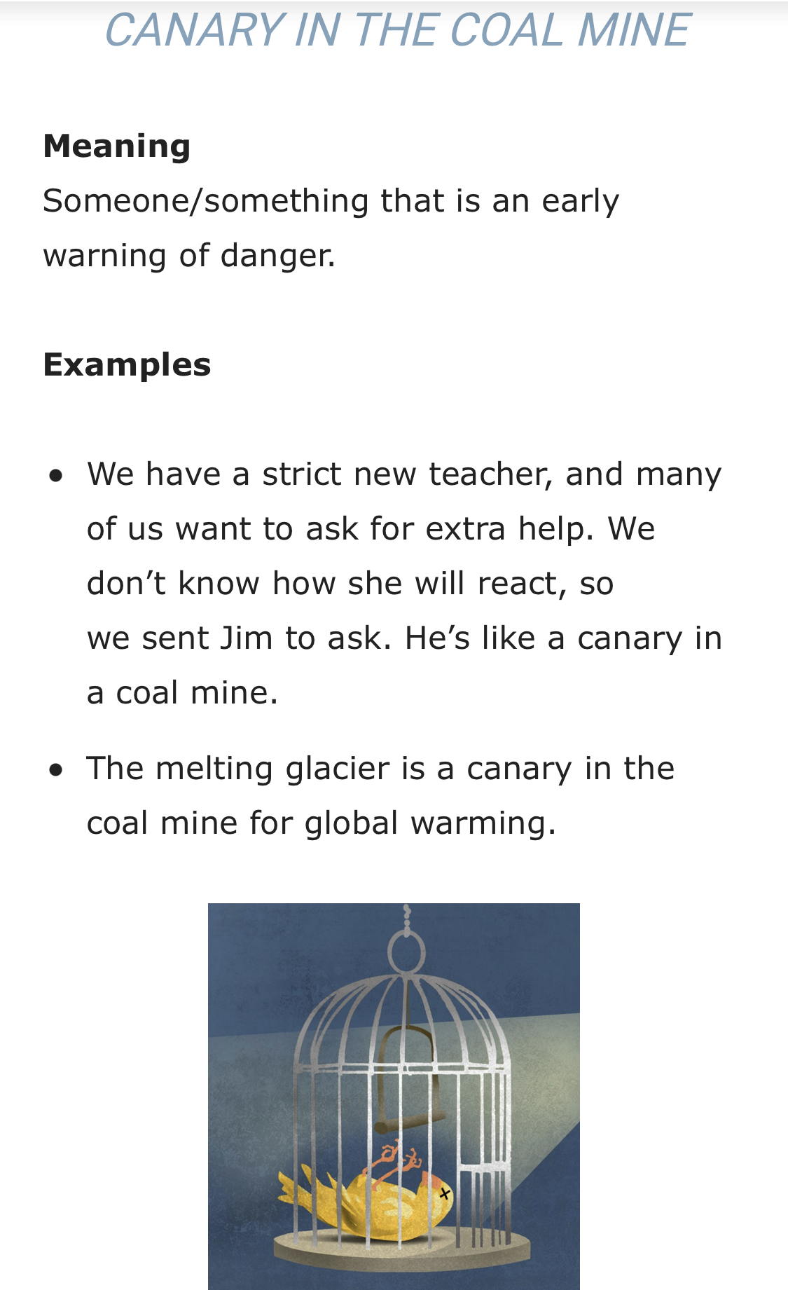 이미지의 관용구 사용에 두 번째 예시인 “빙하가 녹는 것은 지구온난화의 징조이다.(The melting glacier is a canary in the coalmine for global warming)”를 보고 문득 이런 생각도 떠오른다.