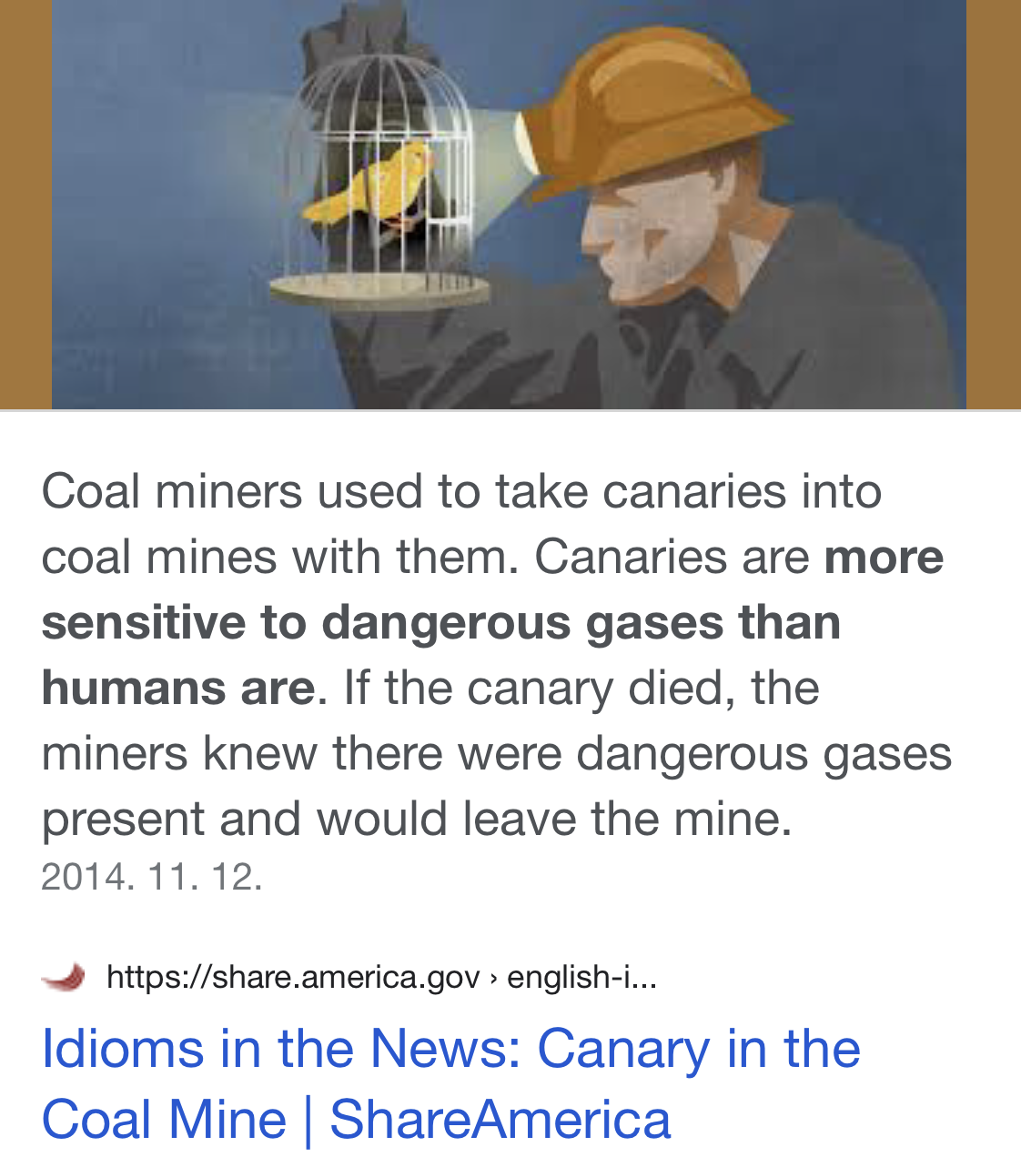“Canary in the coalmine”이라는 말이 영어의 관용구에 있다고 한다. 검색해보고 처음 알았다. 광부들이 탄광에 갈 때 카나리아를 데리고 갔는데, 그 이유는 카나리아들이 인간보다 위험한 가스를 더 민감하게 감지해서였다고 한다. 만약 카나리아가 죽으면 광부들이 그곳에 위험한 가스가 남아있음을 알았다고 한다. 위험을 탐지하는 역할의 어떤 것을 의미하는 영어의 관용구로 쓰이는 듯하다.
