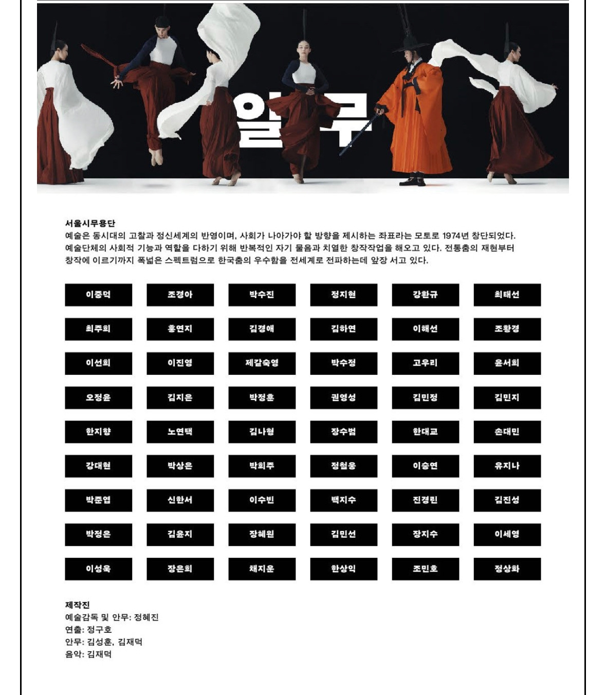 내가 이토록 보고 싶었던 것은 패션브랜드 ‘구호’로 유명한 디자이너 정구호가 무대 연출을 한다고 한다. 일무는 유네스코에 제1호 국가 무형문화재에 지정된 종묘제례악의 의식무를 현대적으로 재해석한 공연으로, 열을 맞추어 추는 춤을 뜻한다.