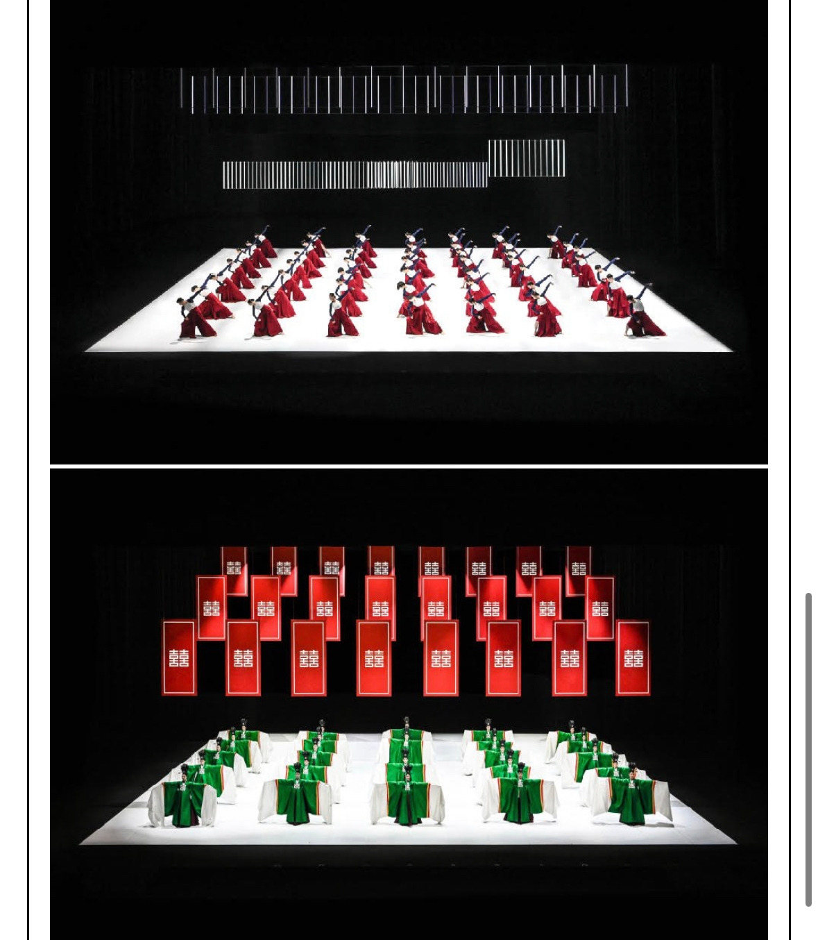 1장부터 4장까지 구성된 공연에서 1,2,3장은 4장 신일무를 위한 빌드업이다. 1장 일무 연구에서는 무용수들의 정해진 순서대로 간결하고 힘 있는 무용동작, 그리고 그것이 반복되고, 반복되는 사람들이 겹쳐지며 일무에 대한 이해를 갖게 된다. 음악 역시 ‘짝’, ‘드르륵’하는 식의 (전통악기 이름을 모른다) 미니멀한 박자감을 주는 음악이 흐른다. 새하얀 무대 위에 떠있는 LED봉이 패션쇼 같은 느낌이 들게 만든다. 이 봉의 대형이 변하는 것을 관찰해도 흥미롭게 볼 수 있을 것 같다.