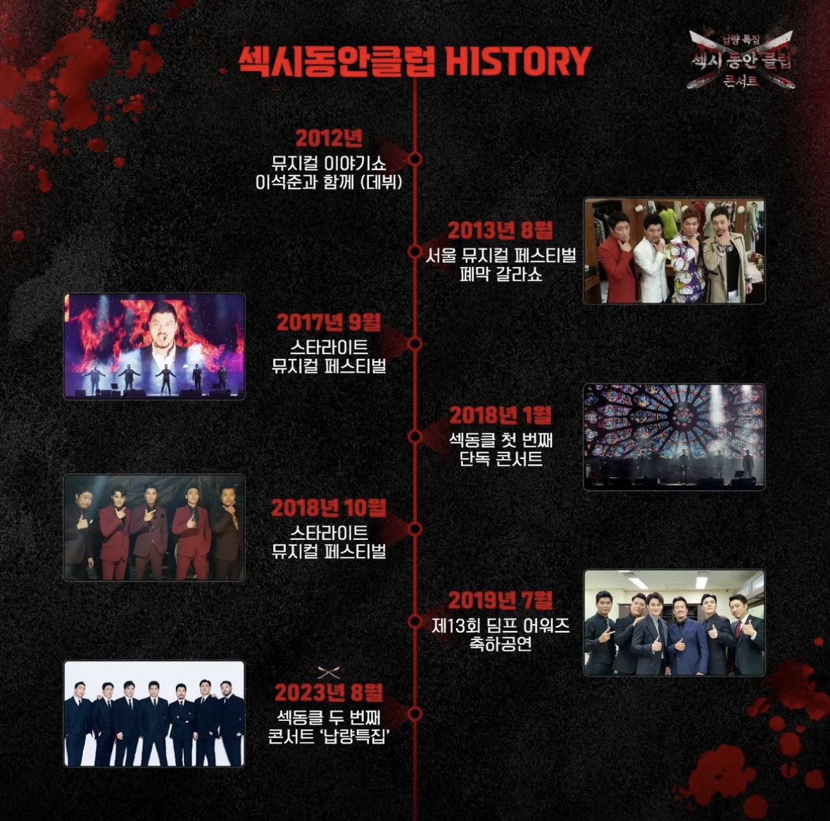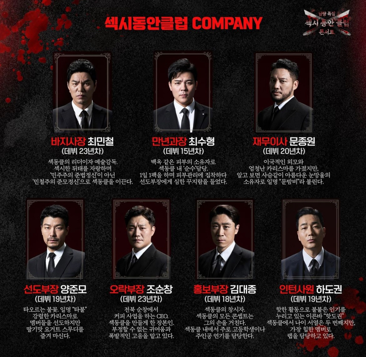 독자의 이해를 돕기 위해 사진을 첨부한다. 의아함이 증폭된다(?) 근데 그것이 이 그룹의 전략이다. 뮤지컬계의 잔뼈가 굵으신 중년으로 구성되어있다. 섹시는 중년의 섹시함, 뭐 그런 것이 있을 수 있으니 넘어가도록 해보자. 동안의 의혹을 풀자면, 같을 동에 얼굴 안자를 쓴다고 한다. 입단 조건이 20년간 같은 얼굴을 유지하는 것이라고 한다.