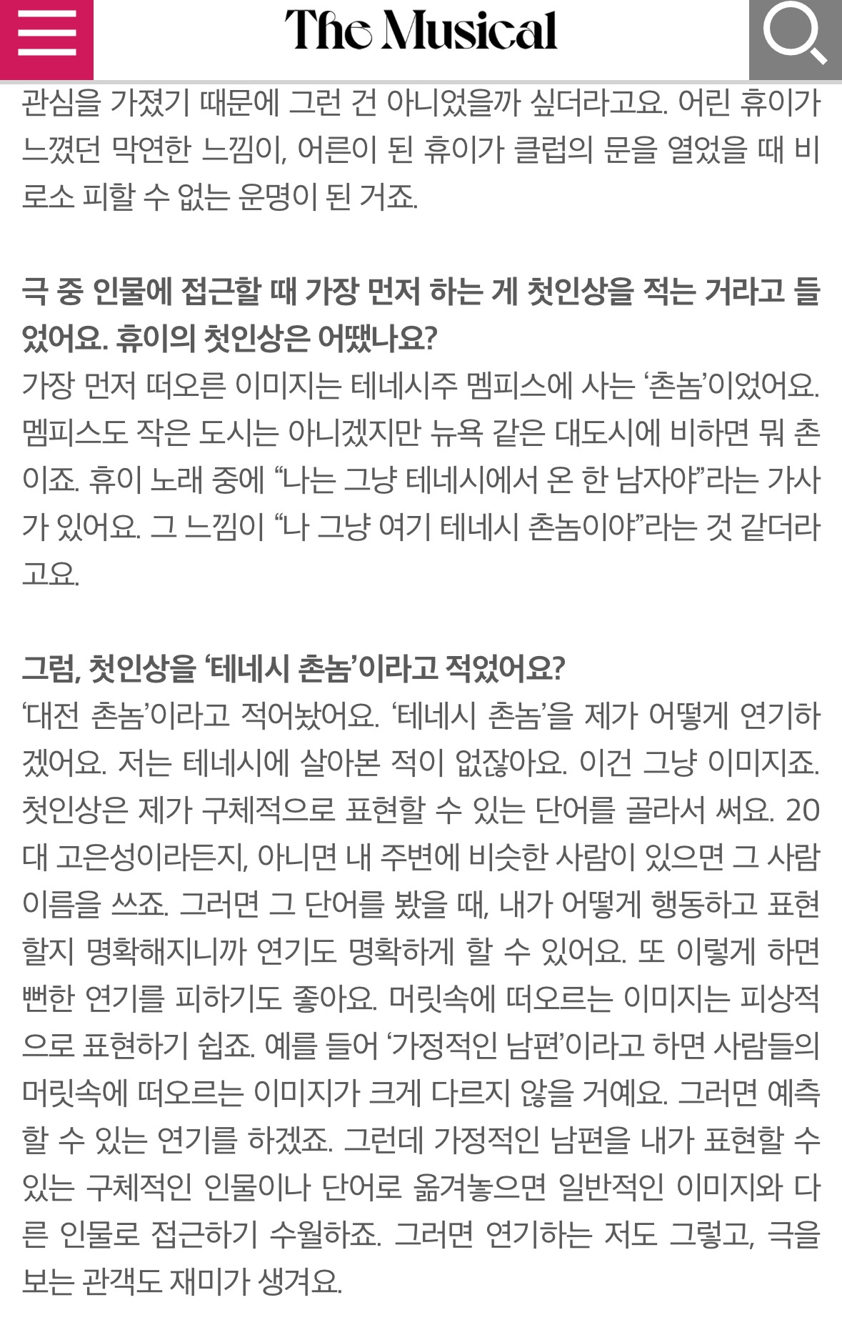 공교롭게도 휴이 역할을 맡은 배우들이 모두 지방 출신이다. 휴이 역할을 맡은 고은성 배우가 한 인터뷰에서 휴이를 '테네시 촌놈', 그리고 그걸 본인에 대입하여 '대전촌놈'으로 캐릭터를 만들어 간 것 같다. 또 다른 캐스팅인 이창섭 배우 역시 최근 '나 혼자 산다'에 고향인 수원으로 보금자리를 옮긴다는 내용의 에피소드를 전했다. 보통 연예인들이 이사하기 전에 집을 공개하고 이사하는 식이어서, 이사 가기 전의 집을 공개한다는 게 의외였는데, 오랜 친구들을 그리워하며 수원으로 이사하는 모습이 왠지 모르게 극 중 휴이의 모습과 겹쳐 보였다. 박강현 배우 역시 대구출신으로, 상경한 지방러의 마음을 잘 알 것 같다.