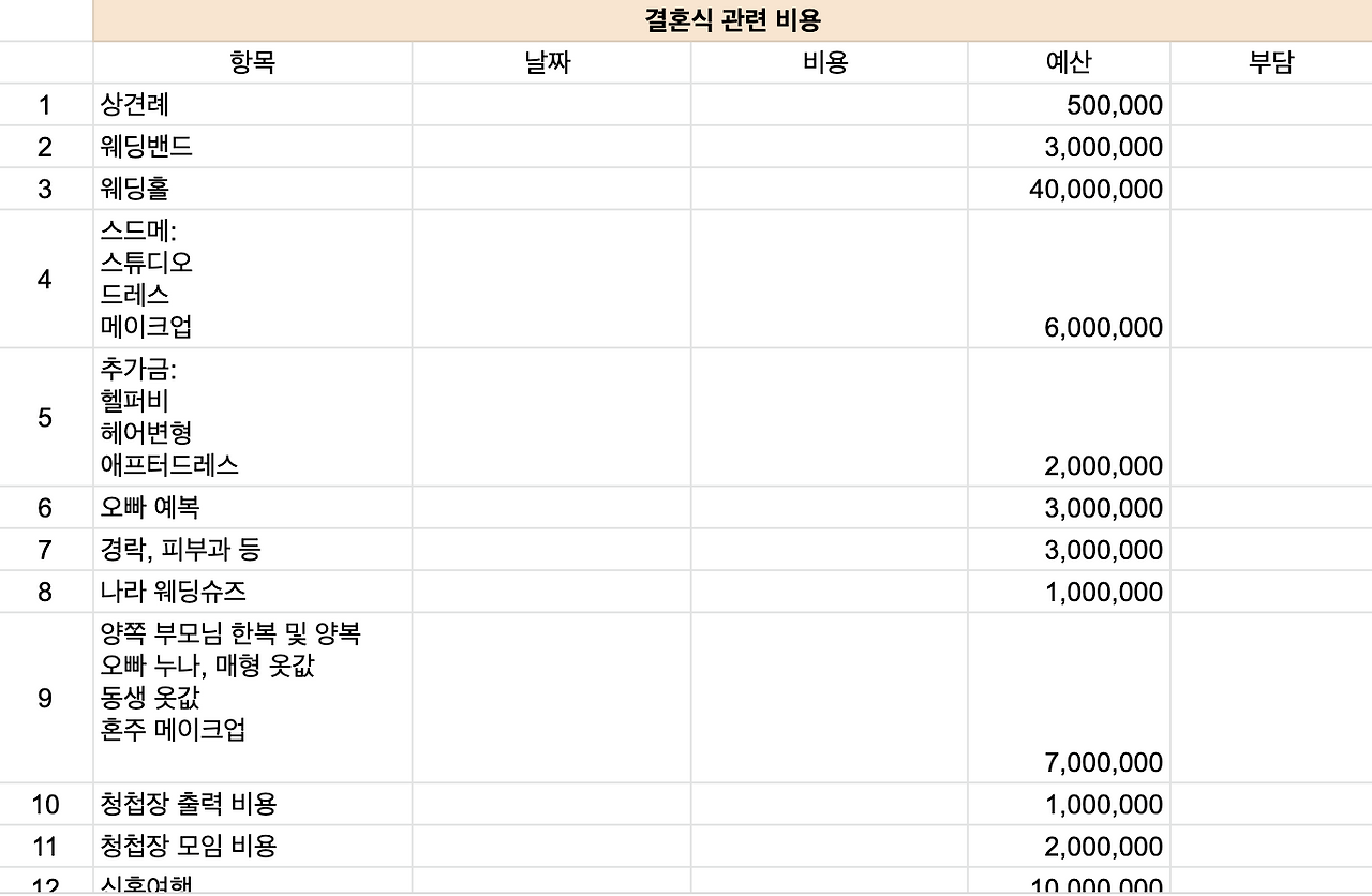 모든 것에 맘껏 힘줄 수 있도록 예산이 풍족하다면 참 좋겠지만, 나는 왠지 결혼식에 많은 돈을 쓰는 것이 아깝단 생각이 들어서 내 나름의 예산표를 짰다.