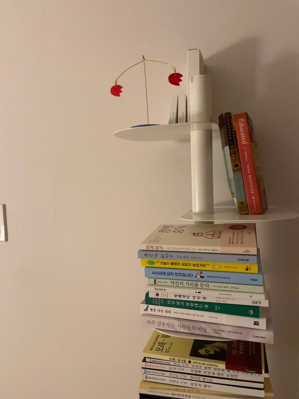 책이 많지 않다면 좀 더 여유롭게 인테리어 효과를 낼 수 있겠지만, 수납이 우선인 나로서는 비슷한 사이즈의 책들을 정리 해 놓았는데 볼 때마다 만족도가 높다. 고양이들이 지나갈 때마다 몸을 비벼 아랫칸 책들은 조금씩 비스듬하게 눕혀져 있는 것들이 참 귀엽다.