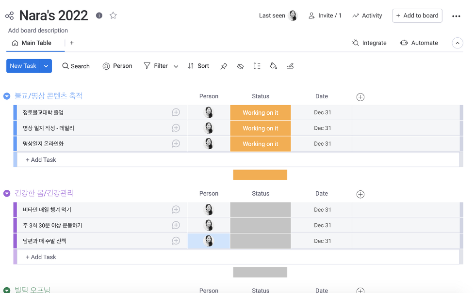 Nara’s 2022라는 보드를 새로 만들어 각 카테고리/태스크 별로 하위 액션들을 구분을 했는데, 아이템별로 일자 설정 및 현황을 기재할 수 있어 내가 어떻게 진행을 하고 있는지 쉬이 확인이 가능하다. 조금 아쉬운 점이라면 만약 태스크나 카테고리가 많을 경우 이런 가장 기본 보드의 형태는 많이 스크롤을 해야 한다는 점이다. 하지만 주요 항목을 고정하는 기능이나, 색상 설정, 폭 넓이 조정 등으로 사용자 개개인의 입맛에 맞춰 수정하는 것이 편하고, 유명한 플랫폼인 만큼 github, 구글 드라이브, 마이크로소프트 오피스 등 여러 타 프로그램 내에 integrate 이 가능해 개인적인 용도보다는 업무적으로, 특히 협업이나 보고가 필요할 시 굉장히 스마트하게 이용할 수 있는 툴이라고 생각이 든다.