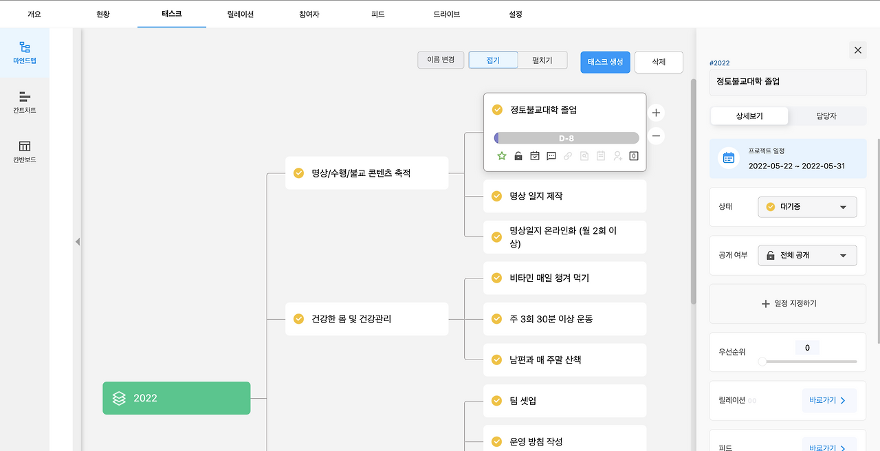 이렇게 정리된 마인드 맵 내 항목을 클릭하여 해당 항목의 진행 타임라인, 상태, (다른 사람과 협업을 한다면) 공개여부 등을 정리할 수 있고, 우선순위 역시 매겨 태스크 별로 중요 순위에 따라 업무를 할 수 있다.
