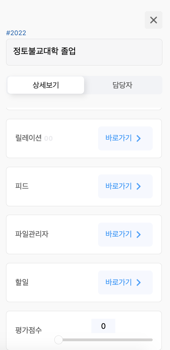 태스크 별로 클릭을 하면 우측에 릴레이션, 피드, 파일관리자 등을 확인할 수 있는 곳이 있어 해당 태스크와 연결 되어있는 타 태스크 역시 함께 확인이 가능하며, 협업을 하게 된다면 이 태스크 오너가 누구인지 등을 보다 명확하게 정리할 수 있다.