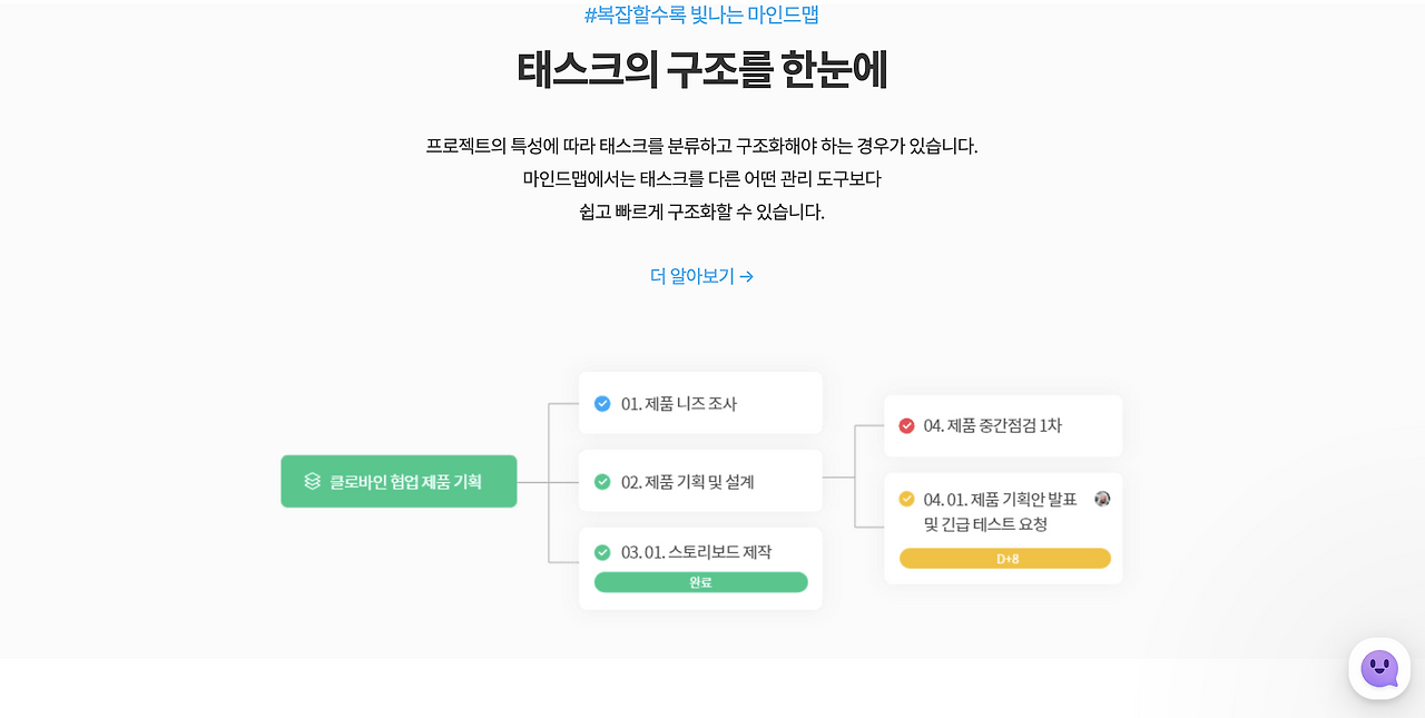 우선 클로바인 내에서도 각 목적에 맞게 <Workspace>를 만들 수 있는데, 이 곳에 들어가면 진행 중인 태스크가 얼마나 진척이 있는지, 데드라인 우선순위에 따른 태스크 리스트 등을 확인할 수 있다. 클로바인이 타 플랫폼에 비해 가지고 있는 다른 기능은 마인드맵 형태의 UI다.