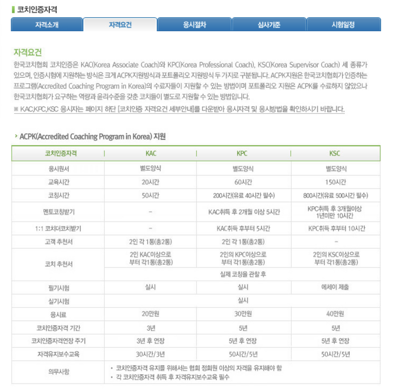 KAC 자격증은 몇해 전 가까운 친구가 준비를 하게 되어 알게 되었던 자격증이다. 코칭 자체에 대한 개념은 전에 다녔던 회사에서 여러 방면으로 교육을 많이 해주며 실제 팀 리딩을 하는 리더급 이상에게는 여러 배움의 서포트를 많이 제공해 주었던지라 기본적인 부분에 대해서는 어느 정도 이해가 있었다. (뿐만 아니라 나의 상사였던 분께서 코칭 기법 기반으로 나를 이끌어주신 것을 나중에 알게 되었다) 당시 좋은 기회로 코칭을 몇번 받았는데 당시엔 커리어적인 개념으로 접목해서만 생각을 했던 것 같다.
