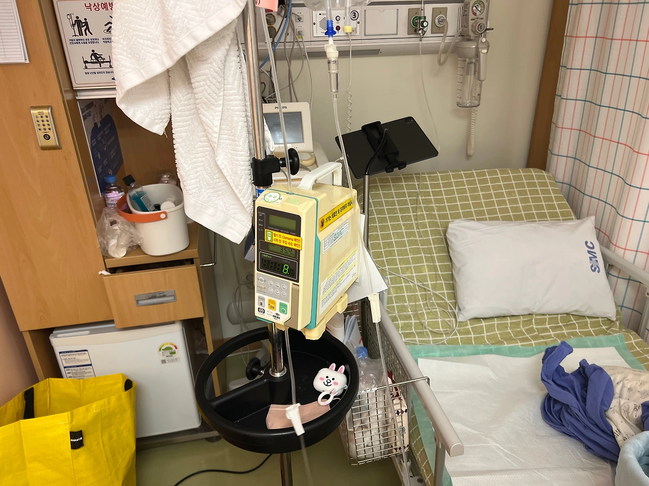 트랙토실은 특정 기기를 통해 삽입이 되는데, 이 기기가 충전코드를 뽑으면 5-7분 정도 지나면 소리가 나서 화장실에 가는 것도 고역이다. 씻는 것은 링거 때문에 당연히 고양이 세수고, 조금만 시간이 지연돼도 알람이 울리는 기기 때문에 본전도 못 뽑고 자리로 돌아가서 다시 기기 연결을 한다. 화장실에서는 배변기에 내가 얼마큼의 소변을 누는지 확인 후 기록을 해야 하는데, 내 몸에서 나온 소변을 보는 것도 우스꽝스러운 고역이다.