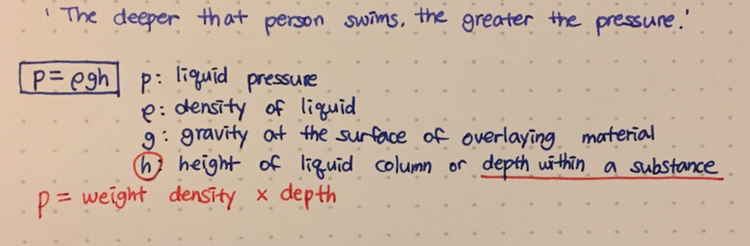 수심이 10m 깊어질 때마다 압력은 1 기압씩 증가한다. 깊은 물속으로 들어갈수록 수압 때문에 우리의 몸은 더 많은 압력을 받고 장기는 쪼그라든다.