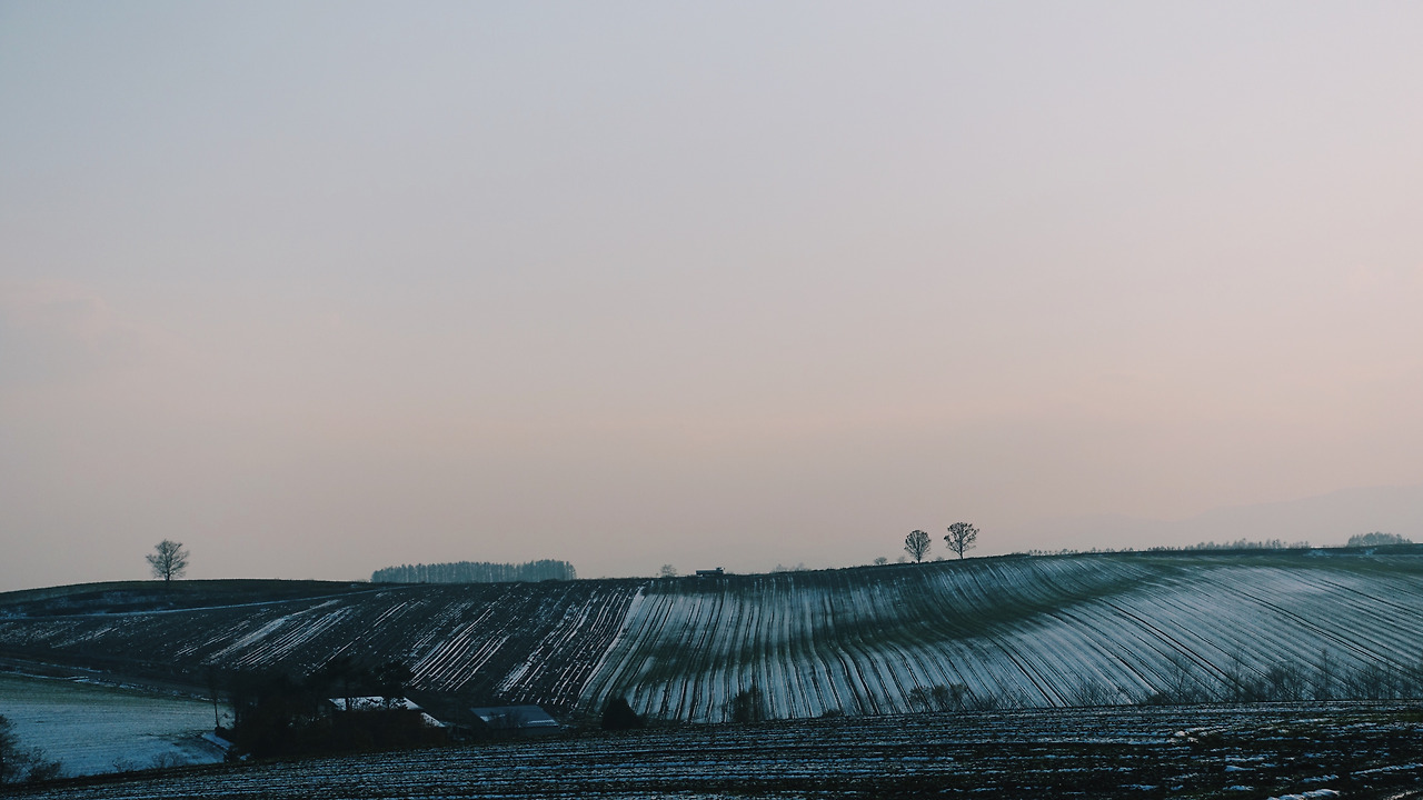 넓은 하늘,눈 쌓인 밭, 쉬고 있는 농기구들까지 모두.