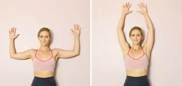 b. 팔을 90도로 구부려 벽에 붙이고, 천천히 위아래로 움직이며 날개뼈를 활성화한다.