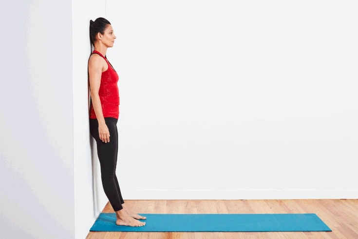 a. 벽에 등을 대고 서서 허리, 어깨, 머리가 벽에 닿도록 한다.