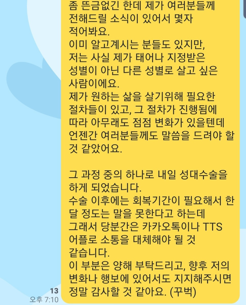 당시에 회사에서는 직속상사와 대표한테만 커밍아웃을 한 상태였는데, 1개월이나 회사에서 묵언수행을 하게 되었으니 사정을 말하지 않을수가 없었다. 어차피 이미 내 외형도 변화하고 있었고, 회사 사람들에게도 언젠가 커밍아웃을 하려고는 했었다. 그래서 나는 어떠어떠한 사람이고, 그렇기에 어떠어떠한 수술을 받으려고 한다고 수술전에 모두에게 공개적으로 얘기했다. 별 반응이 없던 사람도 있었고 응원한다고 해준 사람도 있었다. 어쨌든 얘기하고나니 속은 편했다.