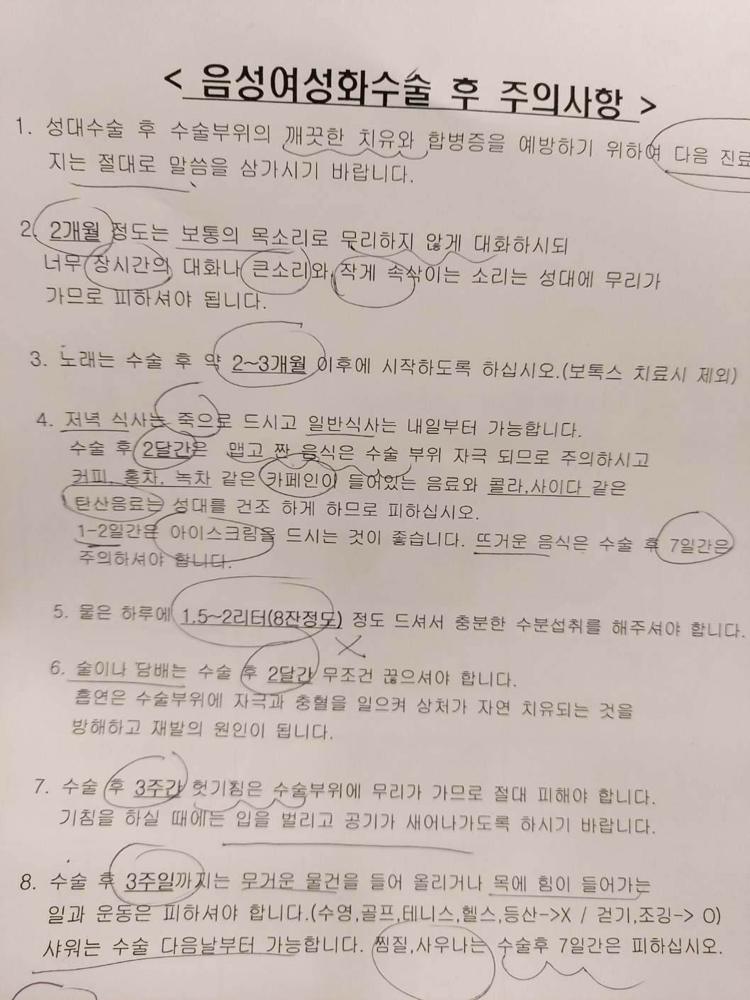 수술을 받고나서 회사에서 누구와 대화할 일이 있을때는 필담으로 소통했다. 내가 콜센터 같은 직종이 아니어서 다행이라고 생각했다. 한 달이 지난 후에는 조금씩 말을 할 수 있게 되었고, 병원을 다니며 음성훈련을 받았다. 성대가 바뀌었다고 해서 목소리가 갑자기 드라마틱하게 바뀌는 것이 아니라 발성법도 바꾸어야 달라진 목소리를 낼 수 있었다. 원래 말하던 방식으로 말하면 이전보다 약간 얇아진 허스키한 목소리가 나왔고, 병원에서 알려주는대로 의식해서 높게 말하면 여성음역대까지 올라오긴 했다. 하지만 굳이 계속 훈련을 받아서 억지로 더 바꾸고 싶지는 않았다.