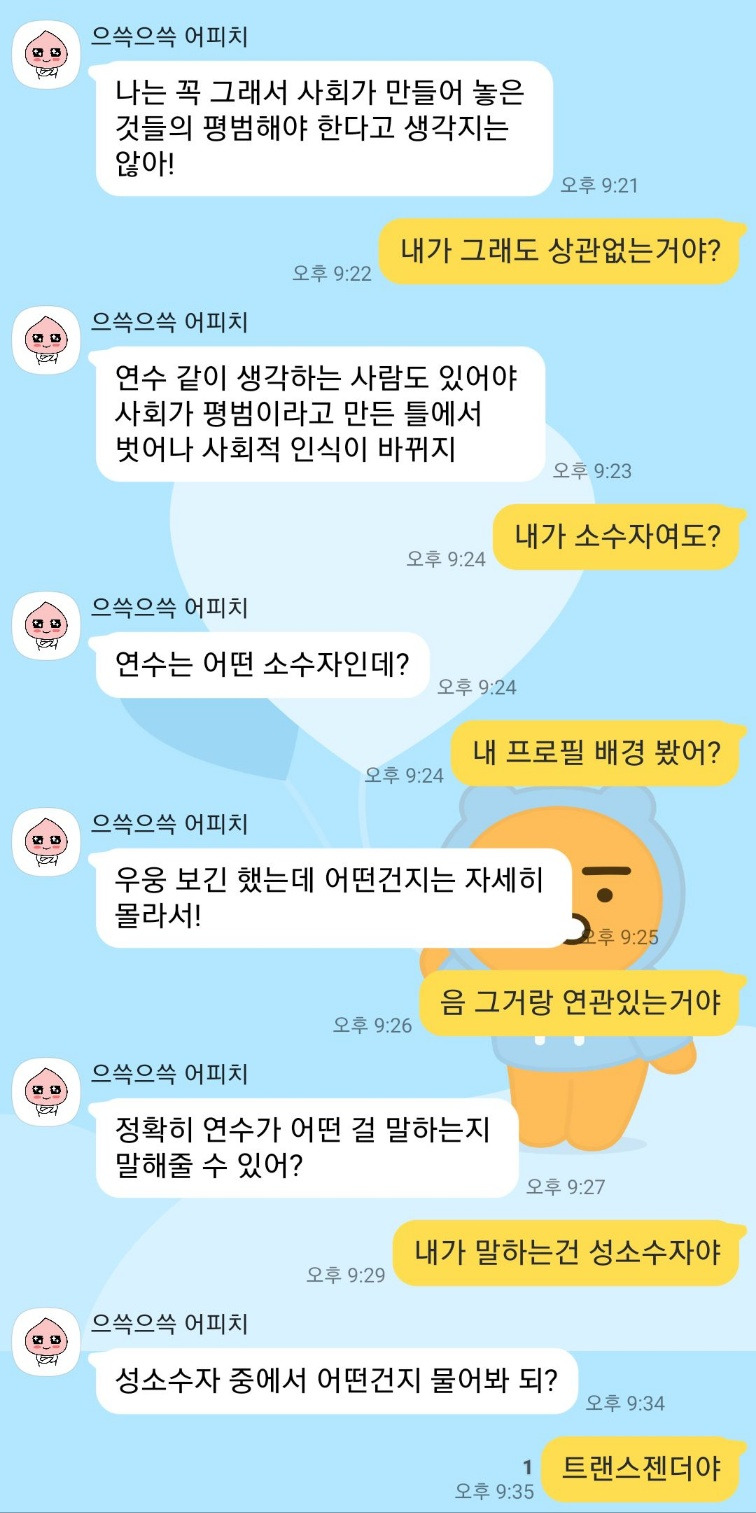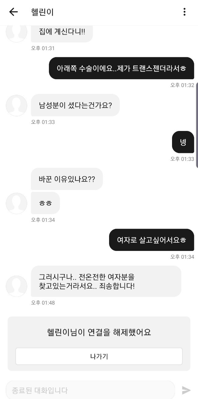 트랜스젠더임을 밝히지 않고 내 소개와 사진을 걸어놨을때는 남자들이 꽤나 호의적이었다. 외모에 대한 칭찬뿐만 아니라, 관심사나 취향, 가치관을 이야기할 때도 남자들은 나의 말에 경청하며 적극적으로 반응해주었다. 그러던 남자들도 내가 트랜스젠더임을 밝히자 다들 나를 즉시 차단하고 도망갔다. "그걸 왜 이제 말하냐, 나는 그런 취향 아니다"라는 질책을 듣기도 하였다. 유사품에 속았으니 화가 났겠지.