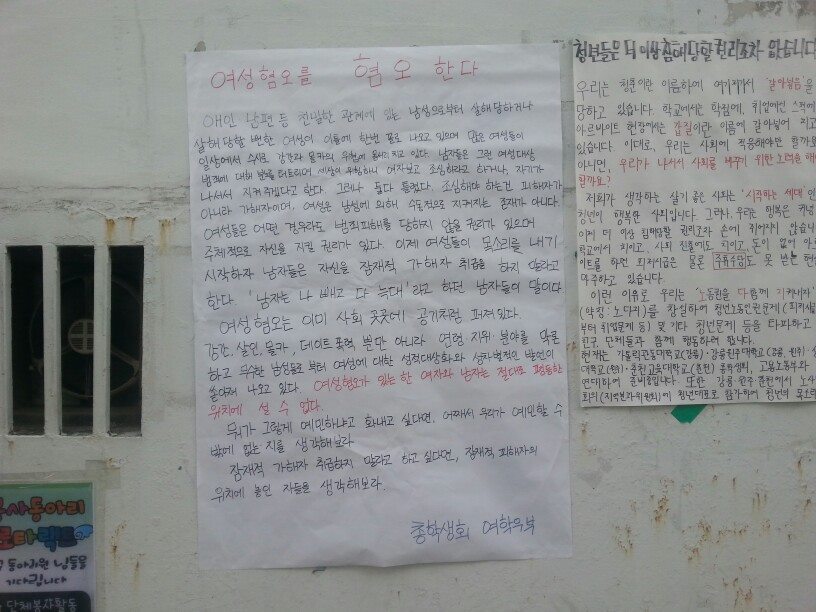강남역 사건으로 인해 우리 사회가 시끌시끌 했을 무렵, 나도 무언가를 해야겠다고 결심하여 총학생회 여학우부의 이름으로 여성혐오를 규탄하는 대자보를 게시했다. 어느 정도의 비난은 감수하긴 했지만, 생각보다 상황이 심각해졌다.