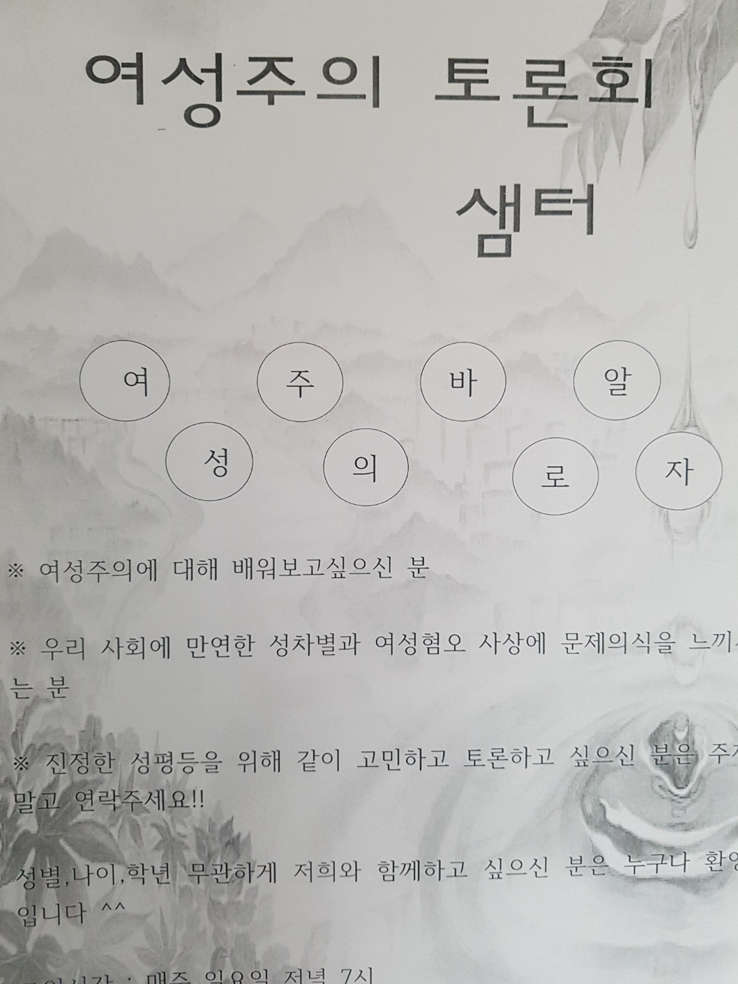 나는 페미니즘 운동을 위해 총학생회 여학우부(당시 이름은 그랬다)에 들어갔다. 총학생회 구성원들은 대부분 페미니즘에 관심이 없었으나 총학생회장이었던 학우가 나를 많이 지지해주어서 용기를 낼 수 있었다.