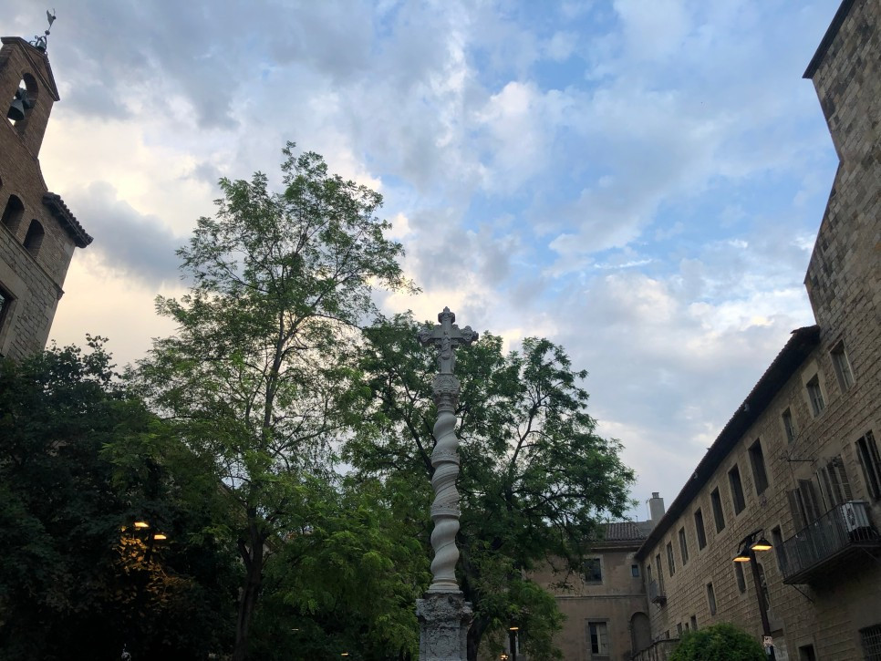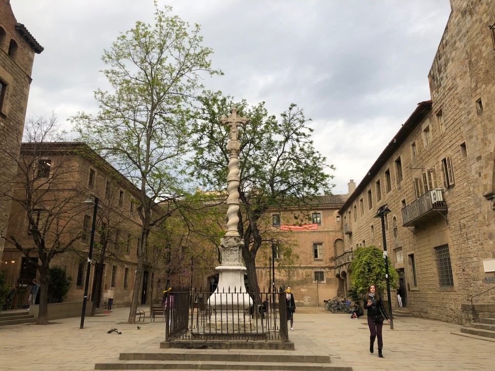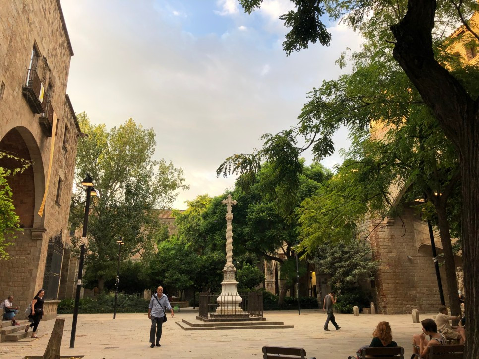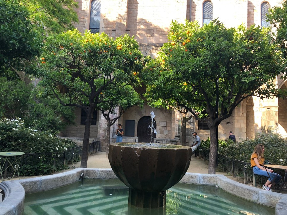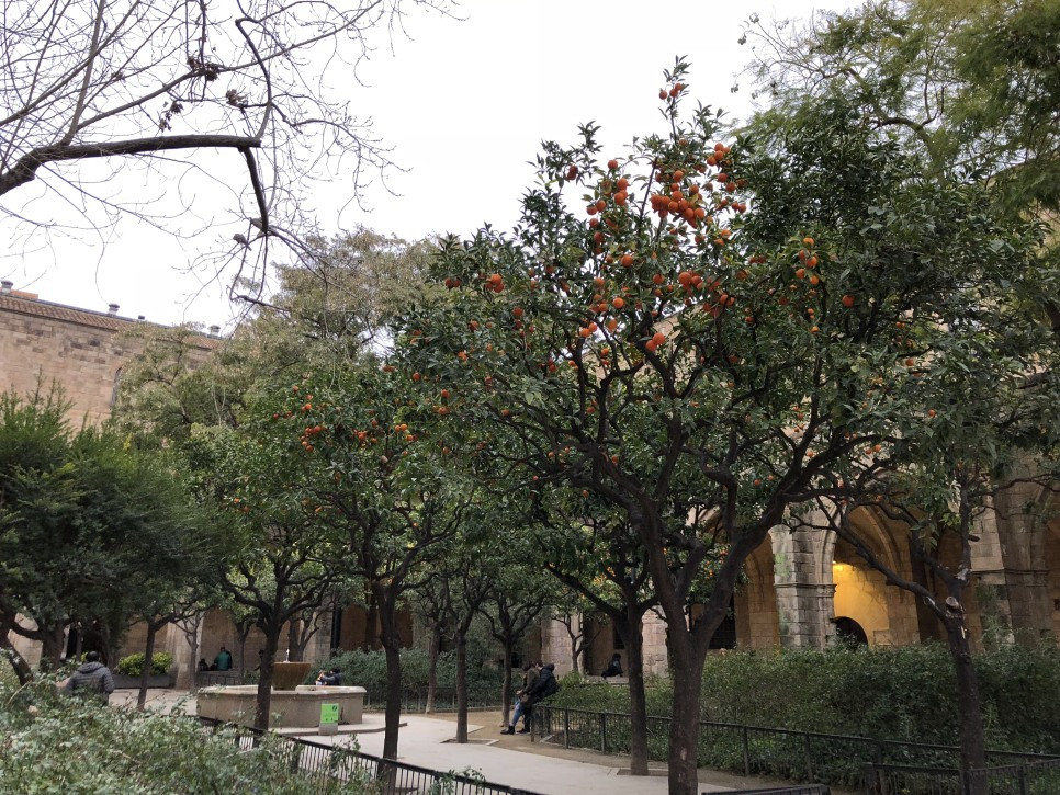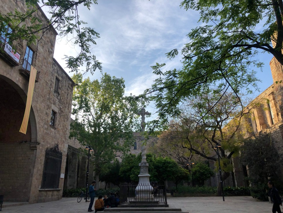 넓은 파티오에는 오렌지 나무들이 자라고 있고 그 아래에서 사람들은 카탈루냐 도서관에서 빌려주는 책을 읽는다. 체스 게임을 즐기는 동네 아저씨들, 강아지를 데리고 산책 나온 커플들, 계단에 앉아 여유를 부리는 사람들이 십자가가 세워진 광장을 공유한다.