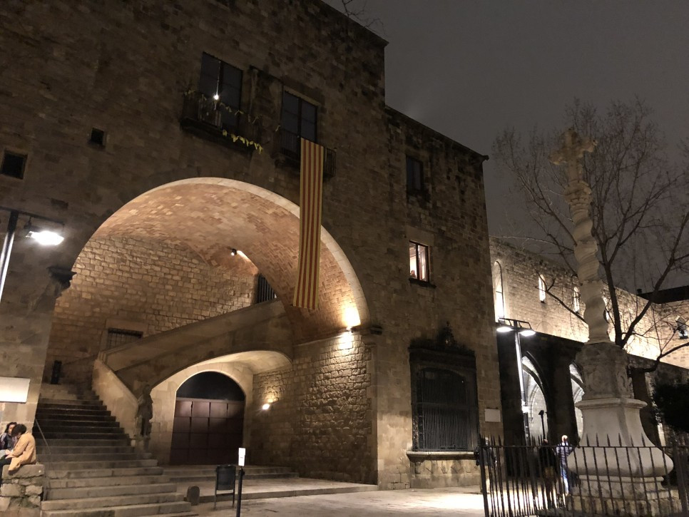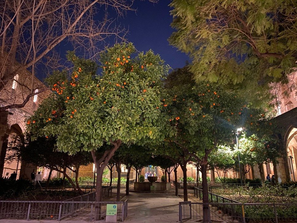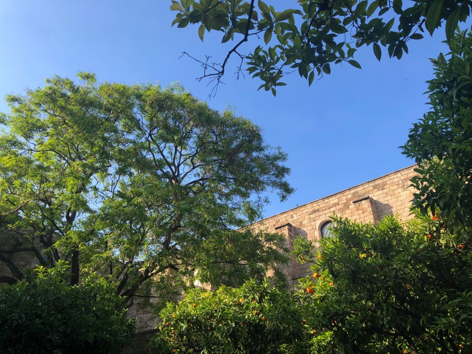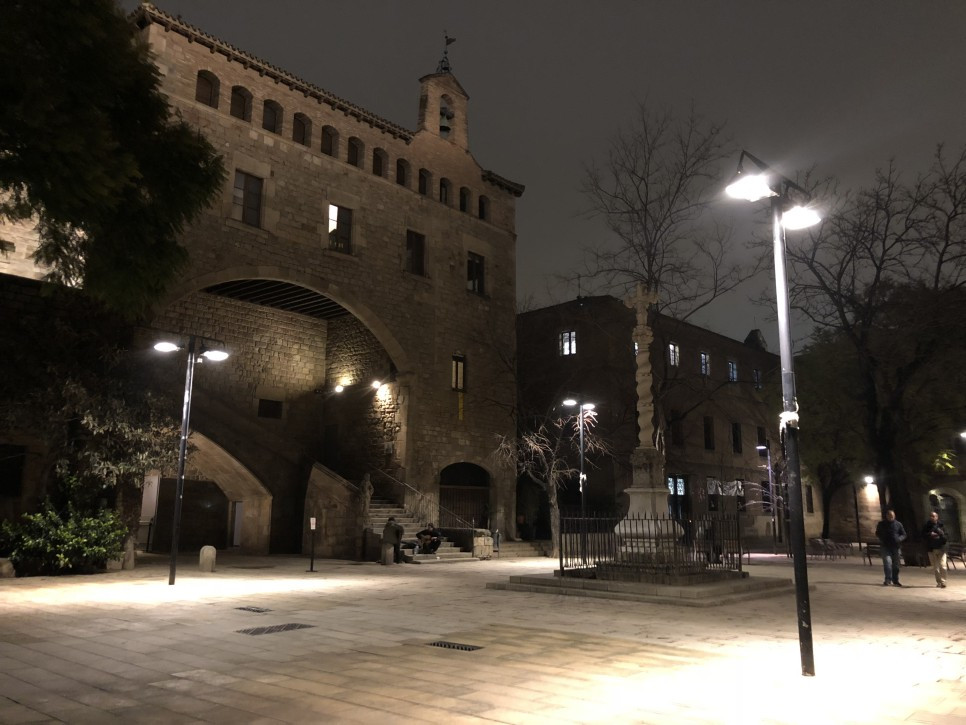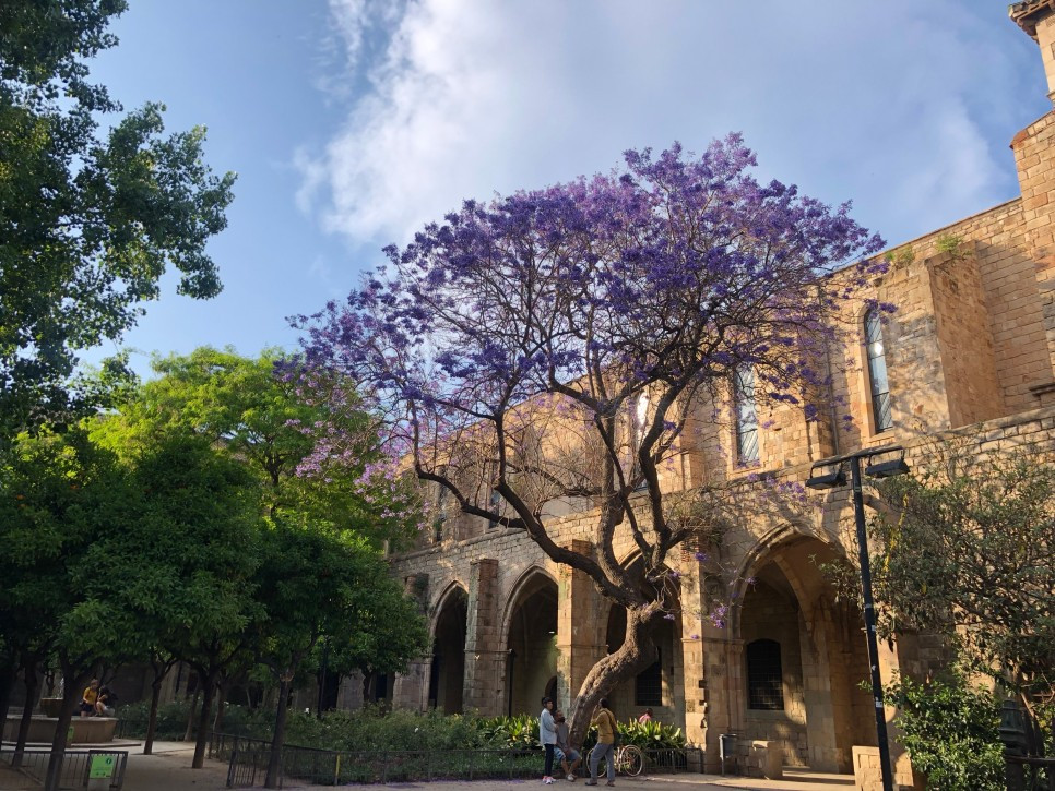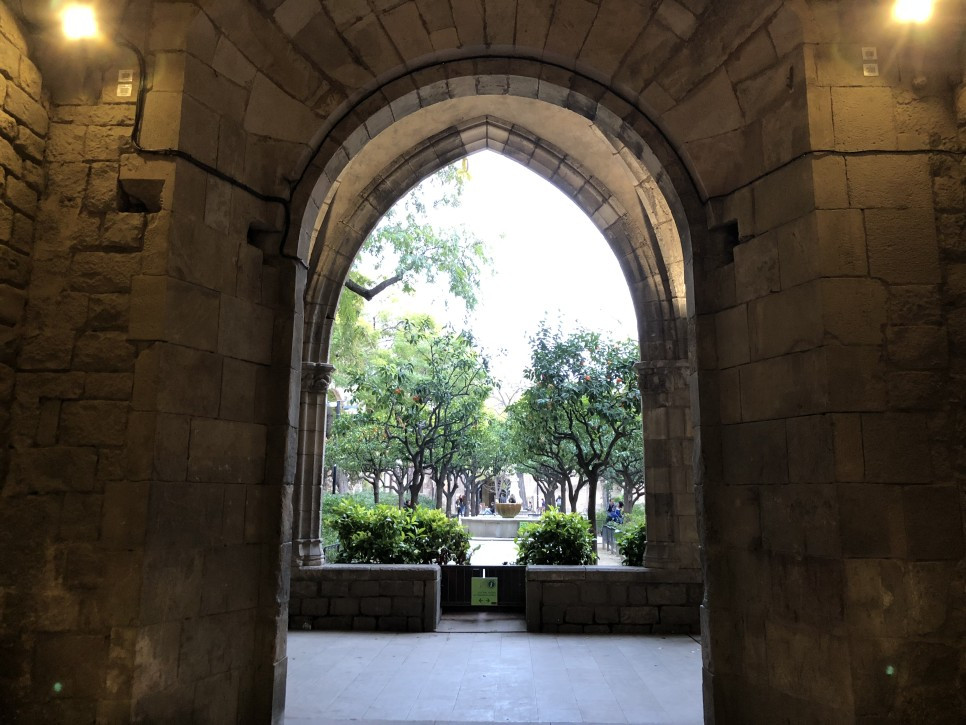 넓은 파티오에는 오렌지 나무들이 자라고 있고 그 아래에서 사람들은 카탈루냐 도서관에서 빌려주는 책을 읽는다. 체스 게임을 즐기는 동네 아저씨들, 강아지를 데리고 산책 나온 커플들, 계단에 앉아 여유를 부리는 사람들이 십자가가 세워진 광장을 공유한다.