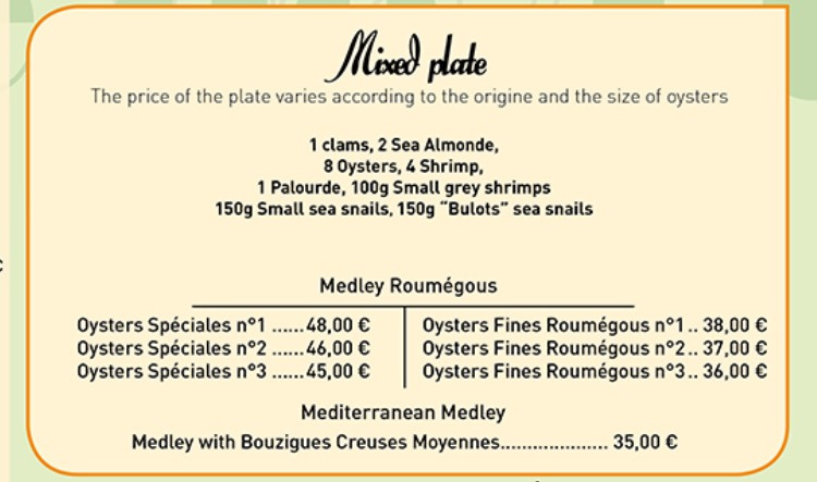 카페 드 투린에서는 큼지막한 굴을 작은 해산물과 함께 믹스드 플래터로 즐길 수 있다. 플래터의 가격은 굴의 종류와 크기에 따라 차이가 난다. 니스에서의 마지막 저녁인 만큼 스페셜 오이스터 1번을 주문했다. 굴을 더욱 맛있게 만들어줄 소비뇽 블랑도 잊지 않고 주문했다.