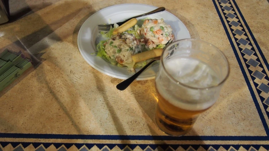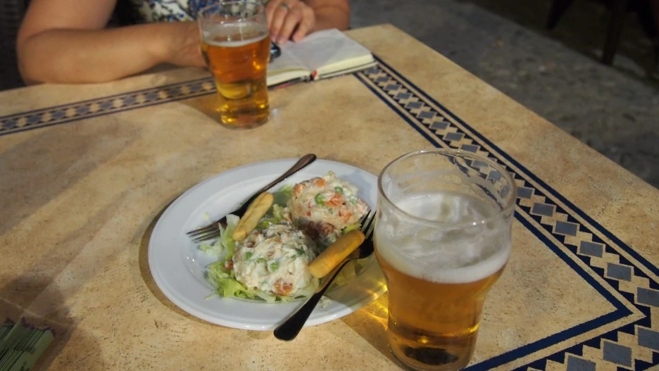 그라나다에 도착한 날, 알바이신 지구를 구석구석 소개해 준 마리나가 처음 무료 타파스와 타페오에 대해 알려주었다. 산니콜라스 광장 바로 옆 타파스 집에서 생맥주인 까냐를 한잔 주문했더니 엔살라다데루사, 러시안식 샐러드가 나왔다. 삶은 감자, 참치, 다른 야채들을 마요네즈로 섞은 샐러드는 맥주와 잘 어울렸다.
