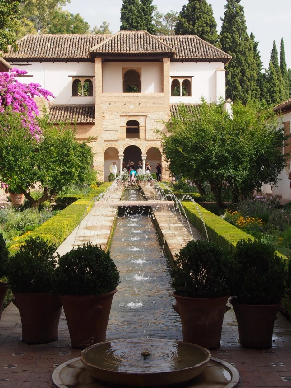 그러나 나사리 왕조의 정원에서는 분수가 주인공이다. 헤네랄리페의 파티오와 하르딘의 한가운데에는 분수가 있다. 직선으로 솟아나는 사이프러스와 다르게 가는 물줄기들이 곡선을 이루며 떨어진다. 대조되는 느낌으로 중심에 위치하고 있는 분수를 정원의 식물들이 한껏 꾸며주는 것 같았다.