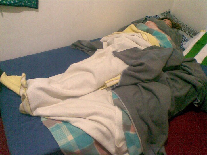 한푼이라도 더 아끼겠다며 이렇게 고생을 하며 3일을 잠을 잤다. 그래도 무료로 묵을 수 있어서 정말 다행이였다. 이렇게 고생하며 자는 사람을 룸메언니는 웃기다며 사진을 찍어 남겨놨다.