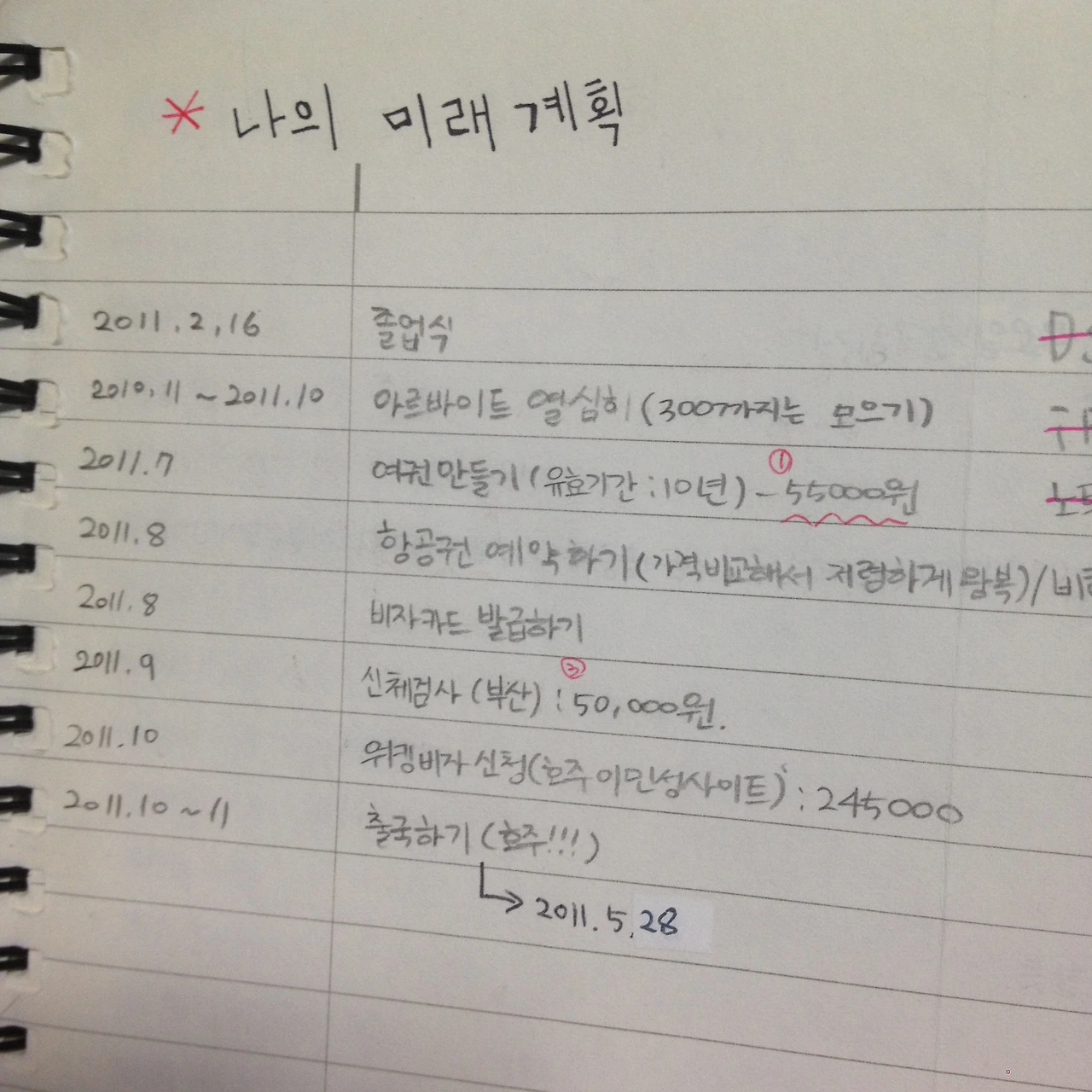 프롤로그에서 얘기를 잠시 했던 나의 분홍색 공책이다. 여기다가 미래 계획, 버킷 리스트, 워홀 준비 리스트 등등 각종 정보들을 기록했다. 우선, '나의 미래 계획'란에 대략의 날짜를 정하여 계획을 세웠고 예산도 책정했다. 예산을 책정해놓으면 아무래도 저축하는데 도움도 되고, 내가 얼마가 필요한지 알 수 있어서 좋았다. 그리고 계획에 맞춰서 비자 신청, 비행기 표 구매 등 실질적인 워홀 준비에 필요한것들을 미루지 않고 할 수 있어 좋다.