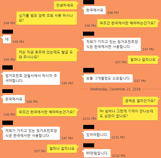 네xx에 검색을 해 본 결과, 싱가폴 범죄 경력을 대행 해 주는 업체를 찾았고 카톡을 보냈다.