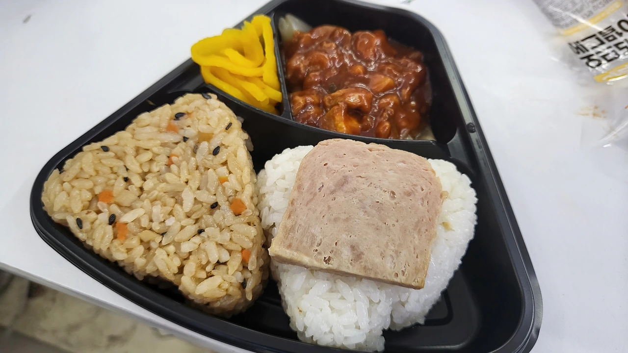 주먹밥 두 개 도시락과 작은 에그말이 김밥