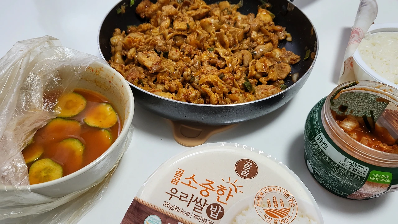 오늘 저녁은 대패 제육볶음과 오이무침, 김치 그리고 밥