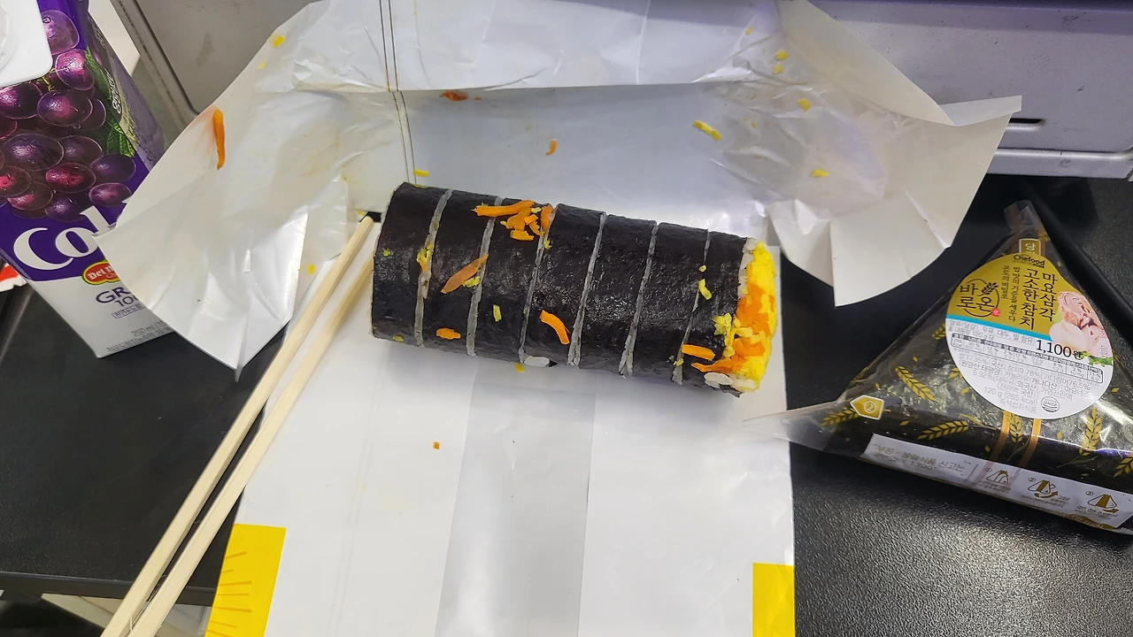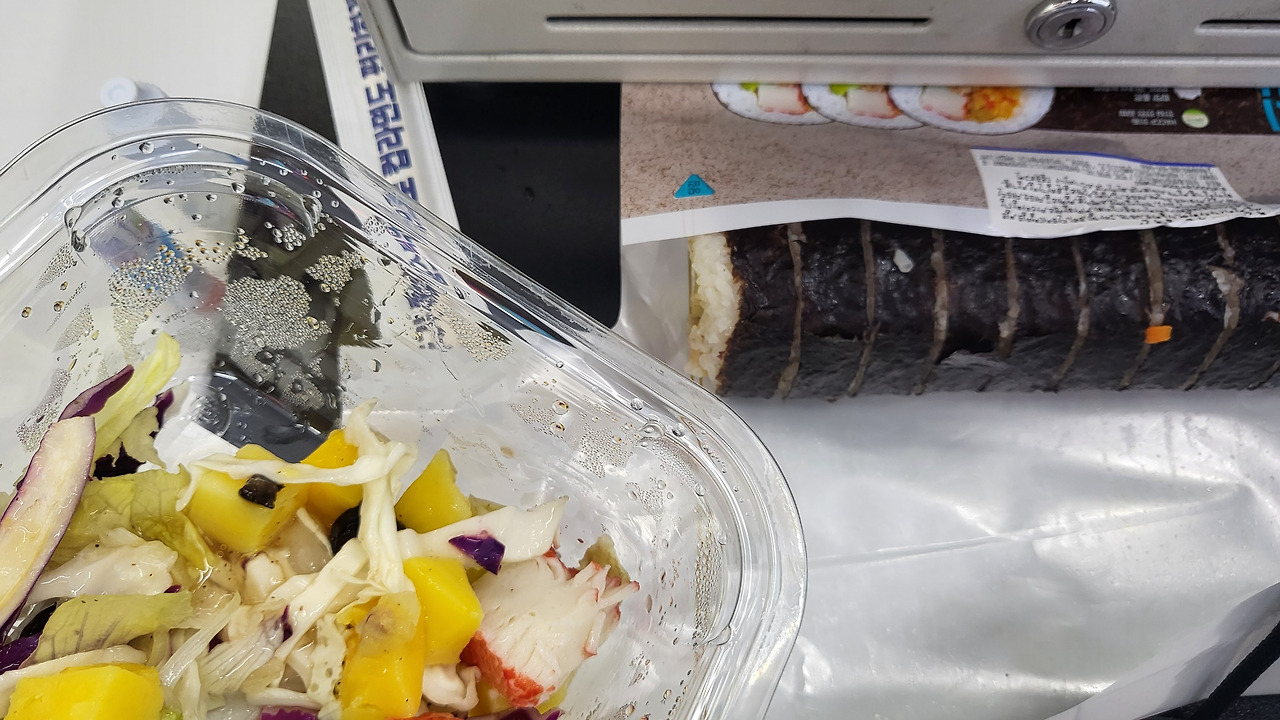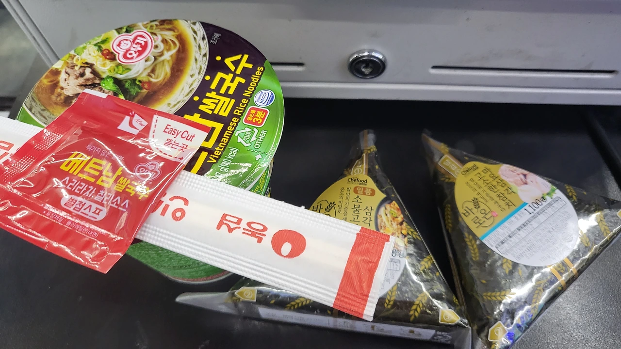 마지막 끼니로 쌀국수 소컵과 삼각김밥 2개