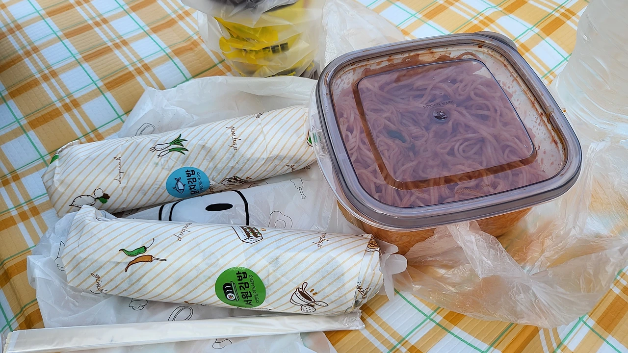 점심 먹고 오는 게 오늘의 목표이기 때문에 김밥 두 줄 사고, 비빔면은 집에서 만들어 용기에 담아왔다