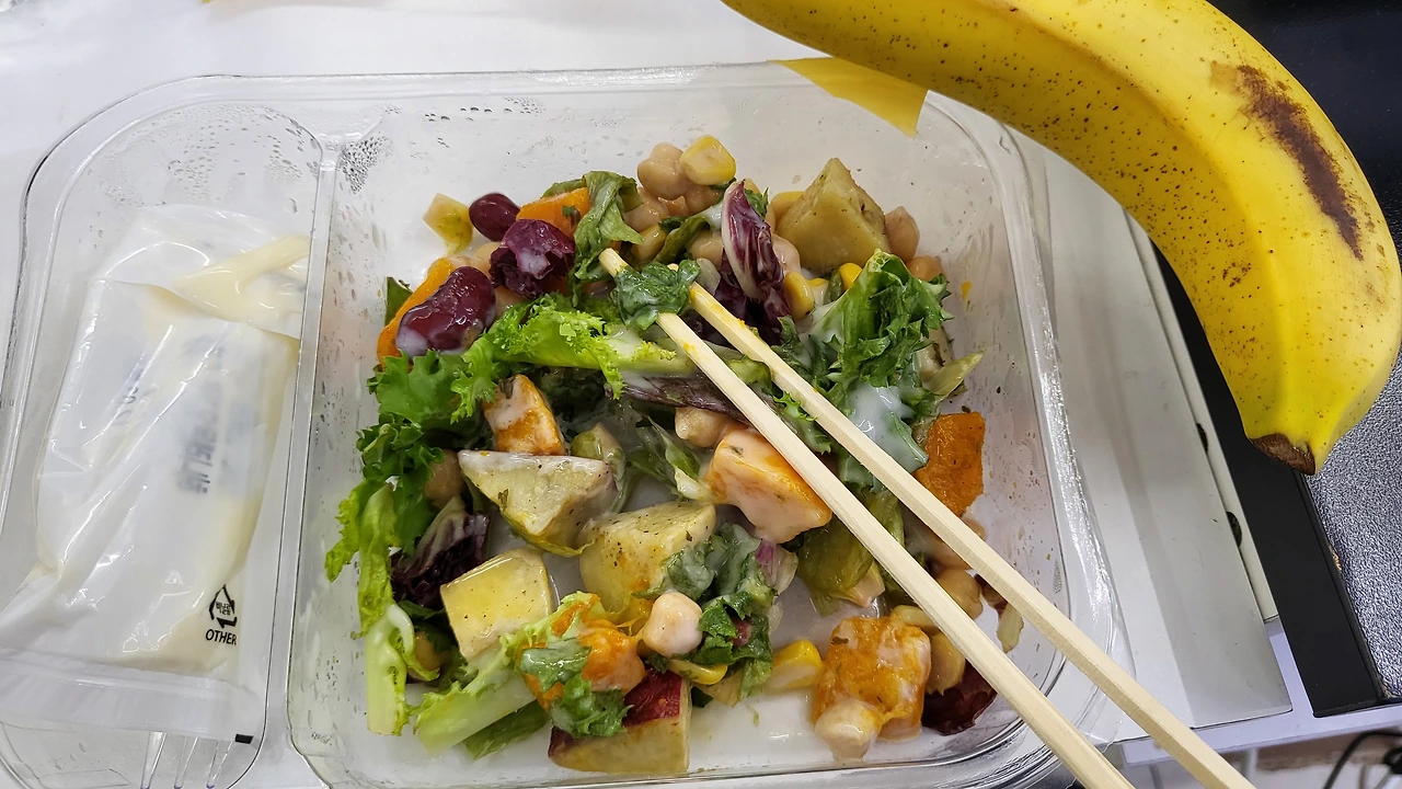 오늘 첫 끼는 샐러드와 바나나