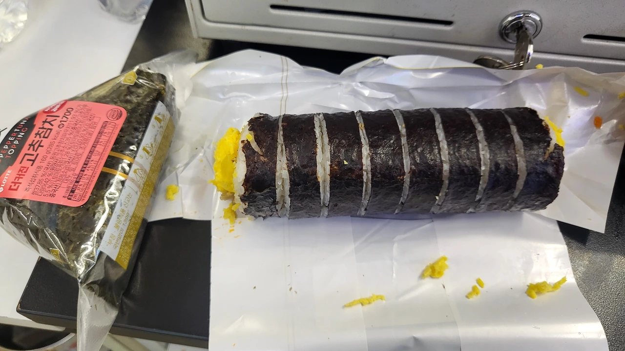 얼른 김밥 폐기 난 것과 삼각김밥 하나를 가져온다