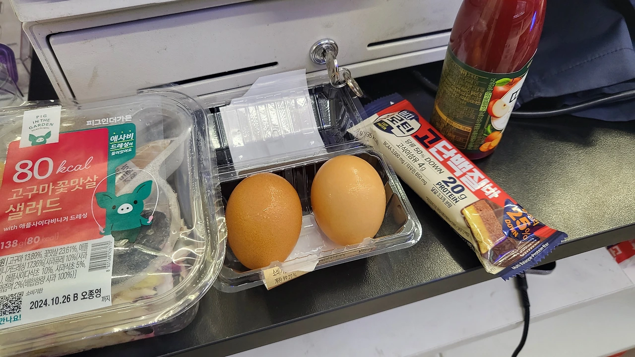 샐러드, 반숙란, 단백질 바, 주스까지