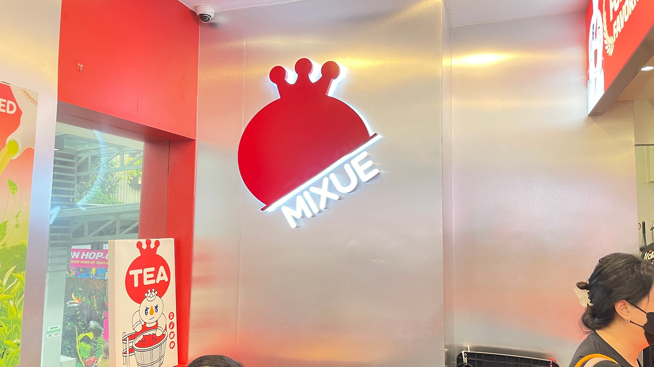 쇼핑몰 바로 앞 Mixue에서 음료 사 먹기.
