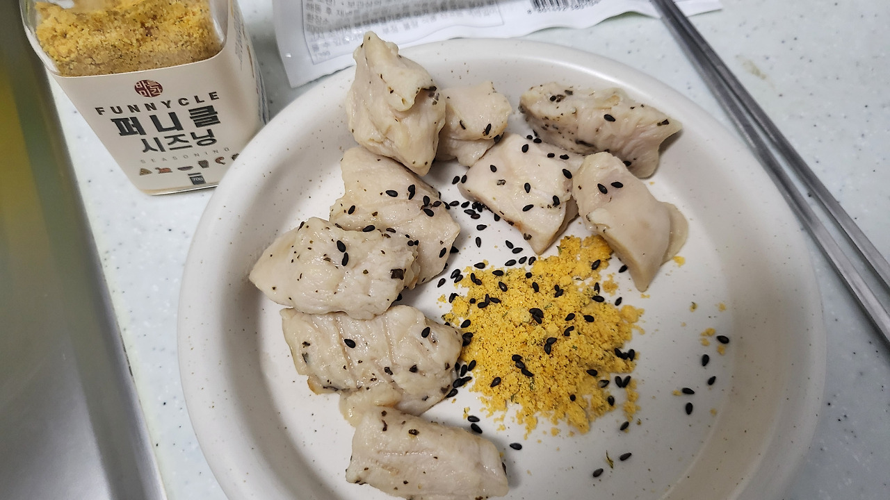 얼마 전에 구매한 닭가슴살에 뿌링클 맛 나는 소스 찍어먹기