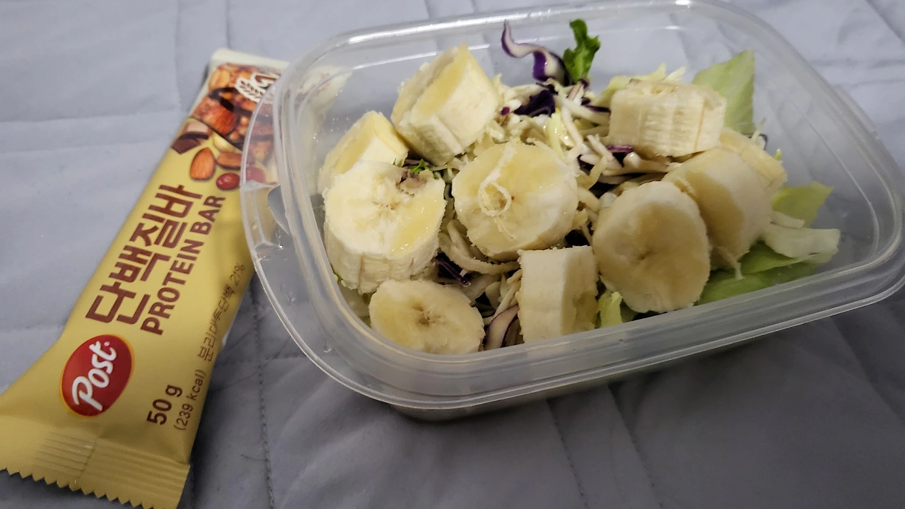 샐러드와 바나나 그리고 단백질바