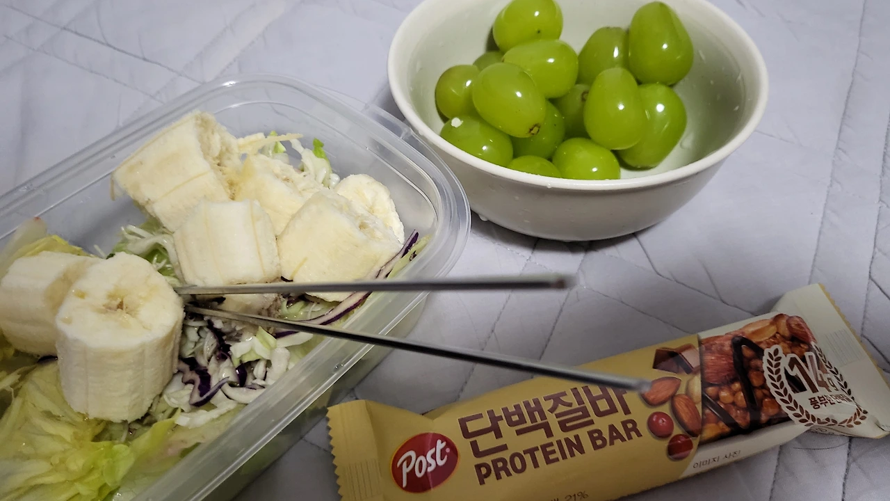 오늘의 첫 끼는 과일, 샐러드, 단백질바