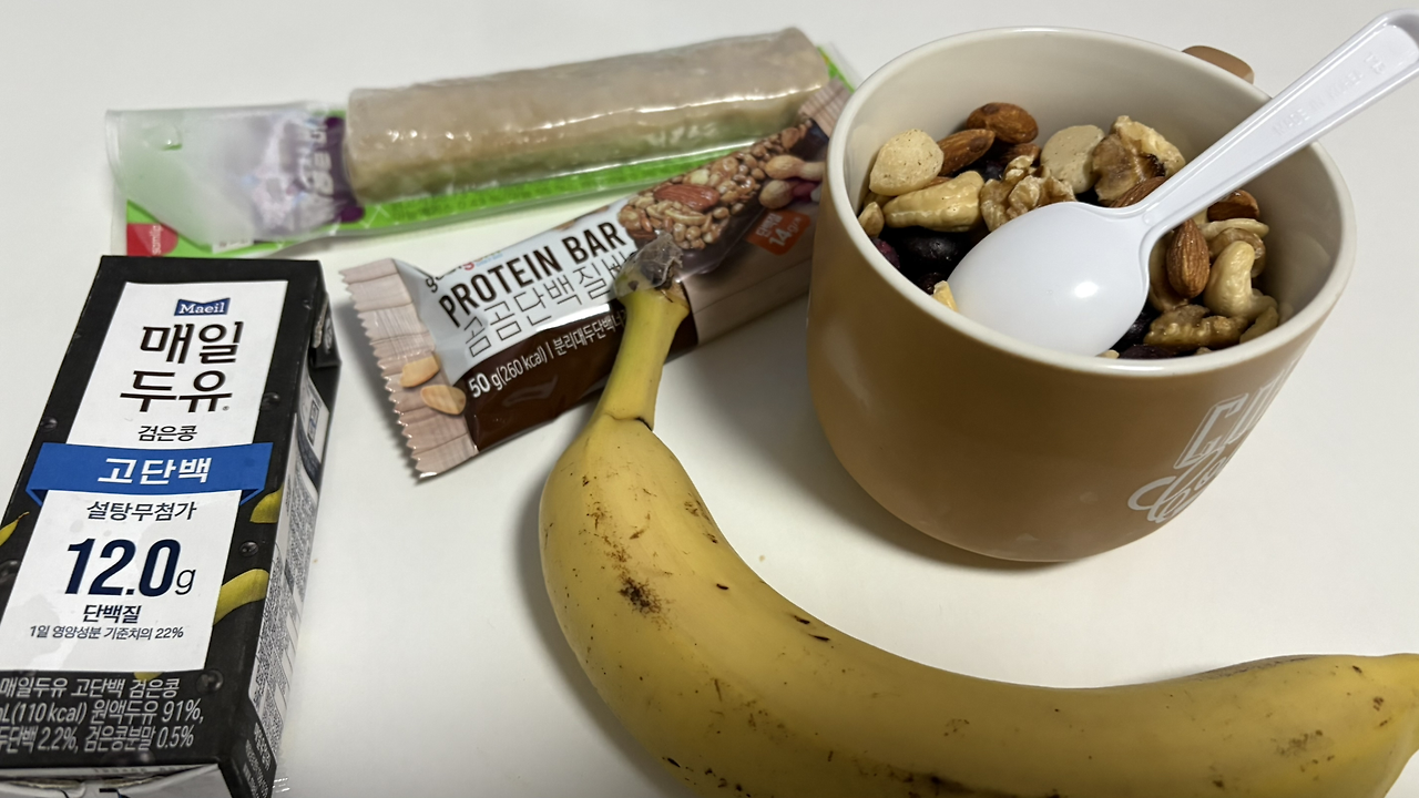 두유, 바나나, 블루베리, 견과류, 단백질바, 닭가슴살바