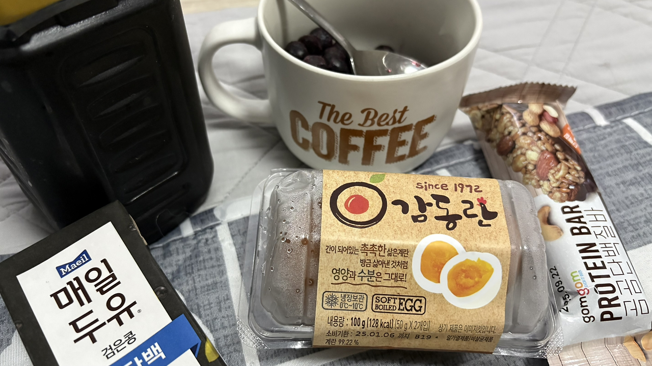 오늘의 첫 끼는 두유, 감동란, 단백질바, 블루베리
