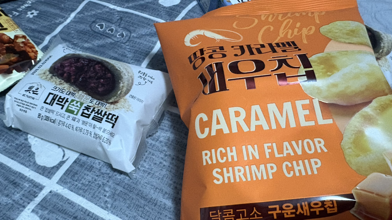 저녁은 배가 별로 안 고파서 집 앞 지에스에서 사 온 과자와 떡 먹기