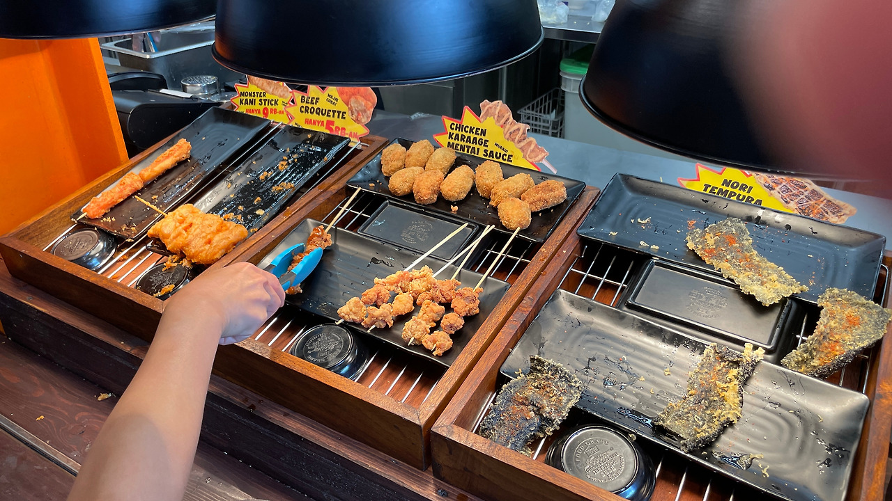 메인 면요리 주문하기 전 간단히 먹을 수 있는 튀김류를 먼저 쟁반에 담는다
