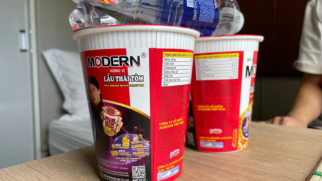 그녀는 라면으로 이미 배가 차서 조금 남겼다