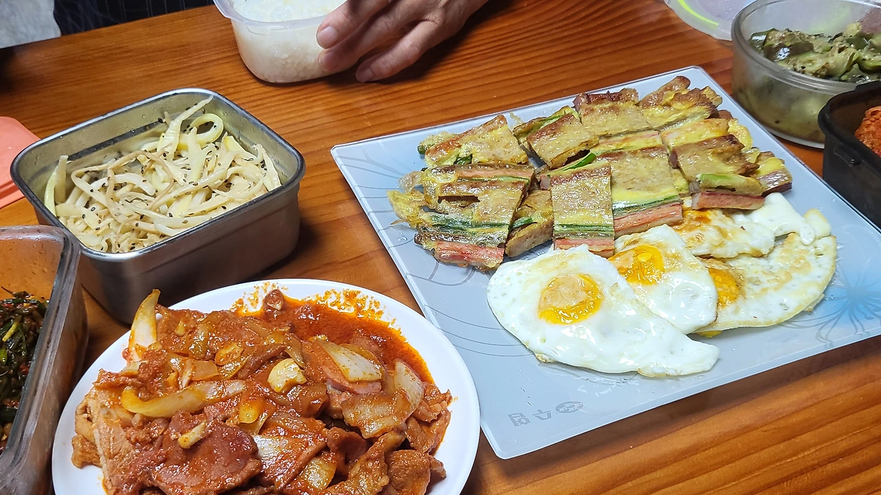 오리 넣어서 굽고, 계란 프라이와 산적, 각종 반찬과 함께 맛있게 잘 먹었다, 후식으론 역시나 과일